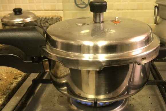 A pressure cooker is a pot with a tight lid that cooks food using steam.